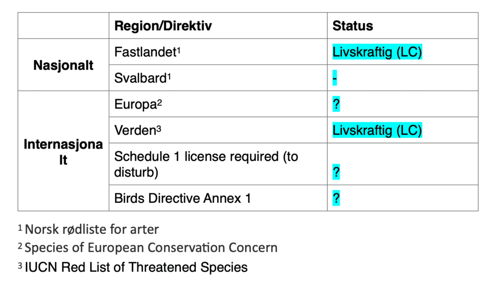 Oppgis i tabellform og utarbeides sentralt. Nettsiden kobles mot en tabell som oppdateres jevnlig (årlig). Dataene til denne tabellen hentes fra et excel-ark på NPs server som inneholder alle statusene for alle artene: