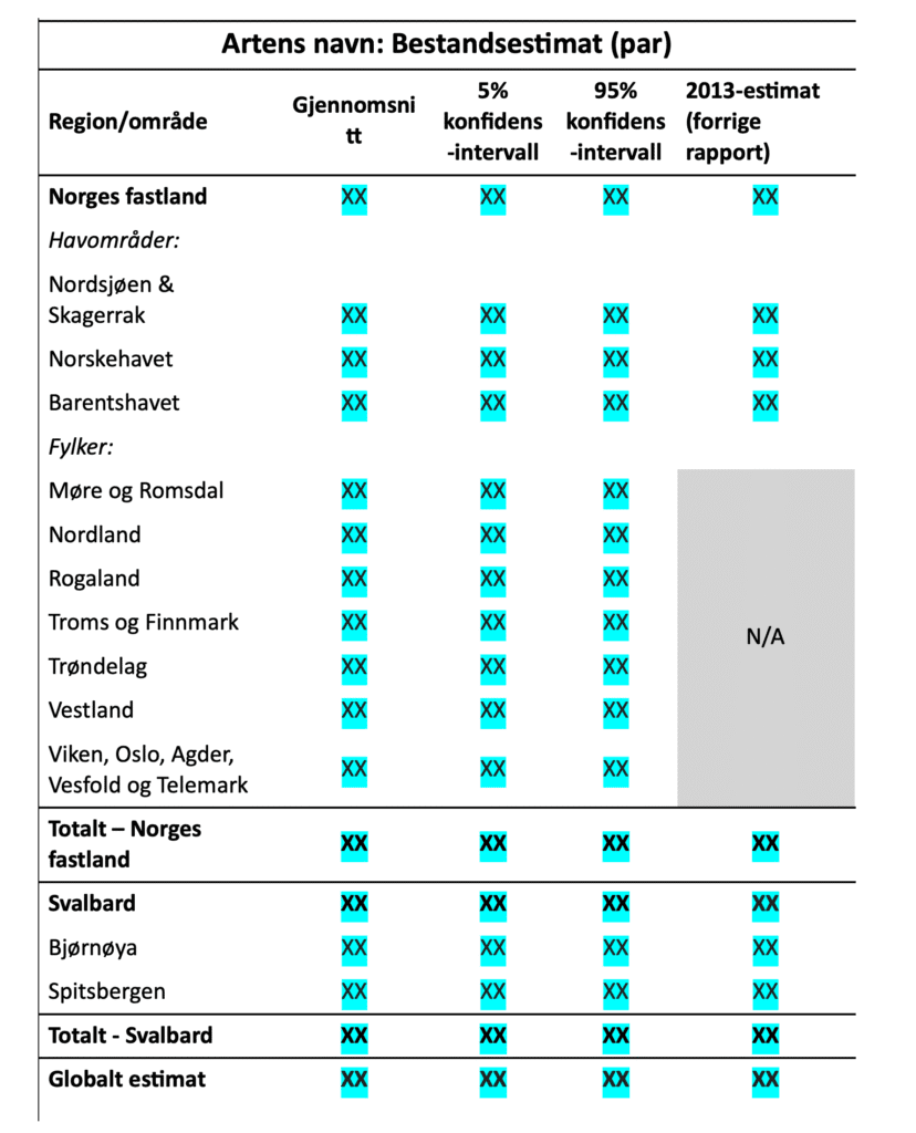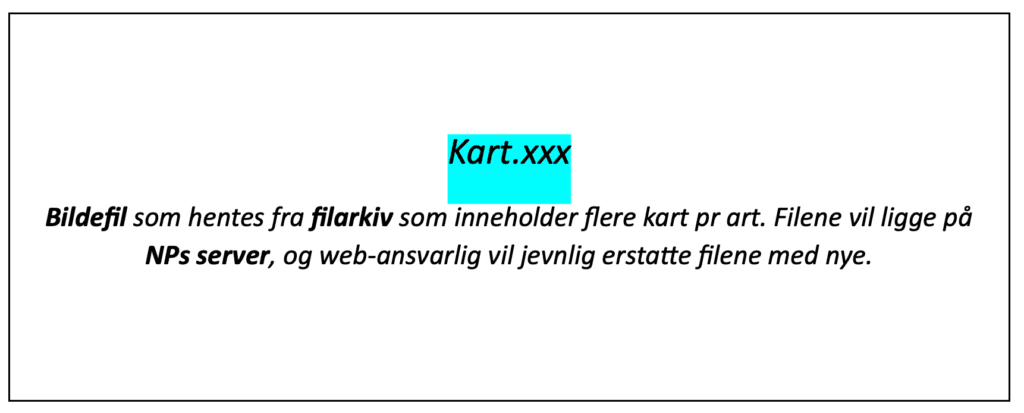 Oppgis i tabellform og utarbeides sentralt. Nettsiden kobles mot en tabell som oppdateres jevnlig (årlig). Tabellen vil ha omtrent dette formatet. Det utarbeides en .csv eller Excel-fil for hver art som dataene kan trekkes fra. Denne filen vil ligge på NPs server: